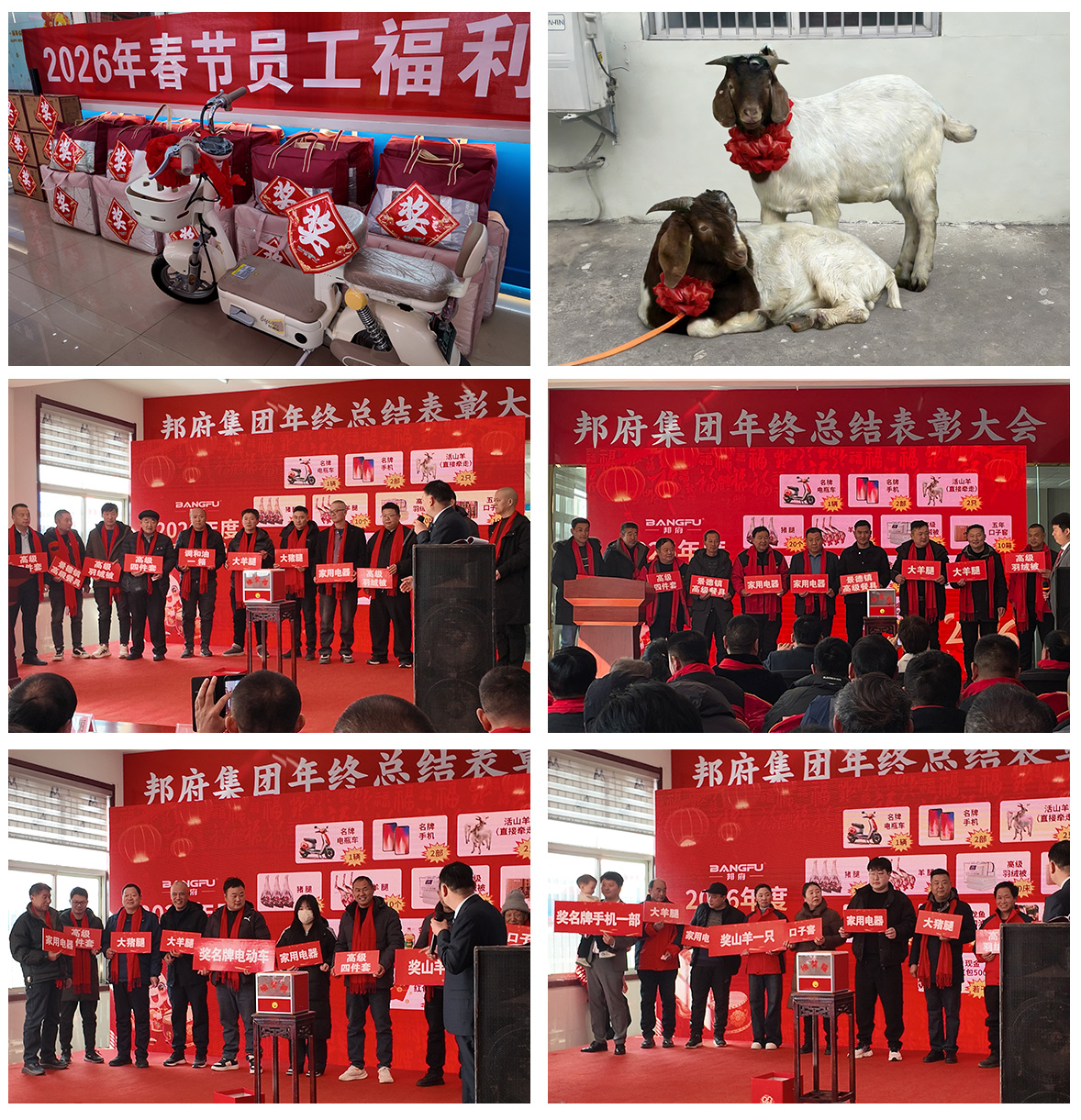 盛会现场,惊喜不停、暖意满满。为回馈全体伙伴与员工一年来的支持与付出,公司精心准备了丰厚多样的抽奖礼品,电动车、活山羊、品牌手机、高档四件套、羽绒被、精美景德镇陶瓷餐具、小家电、5年口子窖、猪腿、羊腿等礼品琳琅满目,涵盖生活方方面面,诚意满满。